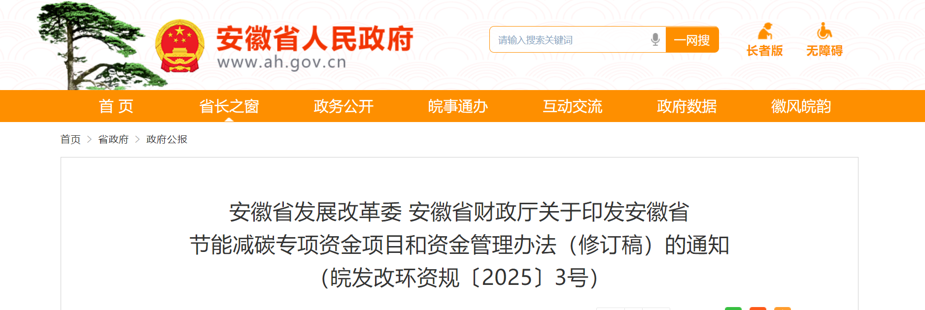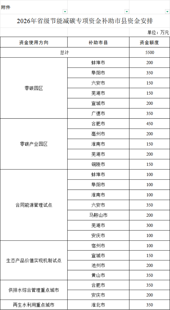 重點支持零碳園區、合同能源管理!安徽2026年省級節能減碳專項資金補助市縣資金安排公示