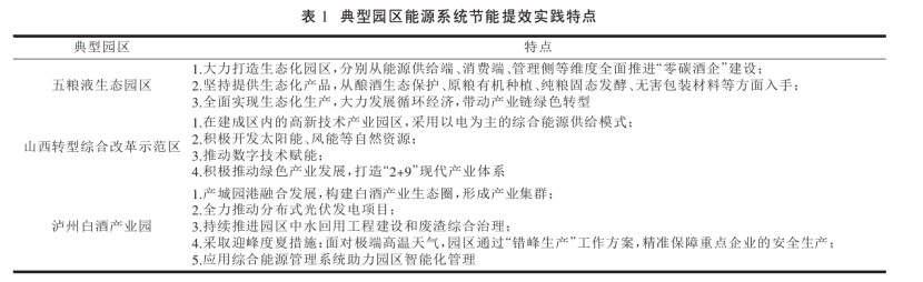園區(qū)在推動我國實體經(jīng)濟發(fā)展和城鎮(zhèn)化發(fā)展中發(fā)揮了關鍵作用,是支撐制造強國戰(zhàn)略的主戰(zhàn)場。有研究表明,園區(qū)二氧化碳排放量約占全國總排放量的31%[4],園區(qū)是資源能源消耗最集中的地方。現(xiàn)階段,為了節(jié)約能源,保護環(huán)境,我國各級園區(qū)都在持續(xù)推動綠色低碳發(fā)展。田金平等研究指出我國工業(yè)園區(qū)節(jié)能提效實踐創(chuàng)新主要體現(xiàn)在以下5個方面: ①聚焦重點領域,全過程系統(tǒng)性推進節(jié)能工作。②集中式能源基礎設施升級改造,多樣化開發(fā)利用余熱、 余壓和能量多級利用。③積極利用可再生能源,推進能源結(jié)構(gòu)轉(zhuǎn)型升級。④積極開展智慧能源探索,實現(xiàn)能源全過程精細化管理。⑤建立健全能源管理體系。表1為典型園區(qū)能源系統(tǒng)節(jié)能提效實踐特點。