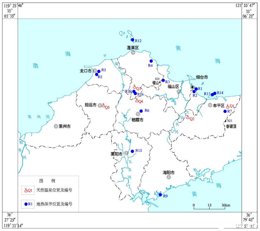 煙臺市地熱田多以點狀形式出露在兩組或者多組斷裂交匯帶附近,屬于低溫開放式對流型帶狀熱儲地熱田。目前,煙臺市共有天然溫泉5處、地熱深井15處。煙臺市已查明地熱流體可開采量約650萬立方米/年,熱資源量為1.65×10^15焦耳/年,相當于標準煤5.62萬噸/年。