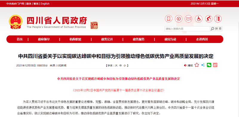 12月8日,中共四川省人民政府在官網發布了《中共四川省委關于以實現碳達峰碳中和目標為引領推動綠色低碳優勢產業高質量發展的決定》(以下簡稱《方案》)。