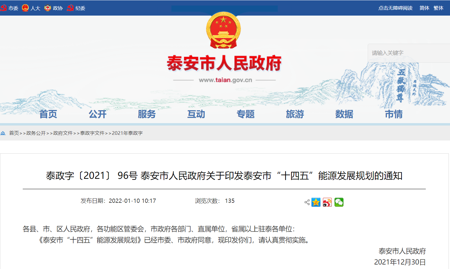 文章來源:地大熱能 發布作者:山東省泰安市人民政府 發表時間:2022-01-12 09:06:56瀏覽次數:3934