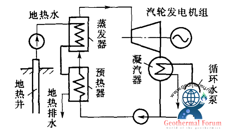 雙循環地熱發電系統是利用地下熱水來加熱某種低沸點工質,使其進入汽輪機工作的地熱發電系統,又稱中間介質法或低沸點工質循環。它是為克服閃蒸地熱發電系統的缺點而出現的一種循環系統。地下熱水用深井泵抽到地面進入電站內的蒸發器,加熱某一種低沸點介質(如氟里昂11、氯乙烷等),使之變為低沸點介質蒸氣,然后通入汽輪機做功發電,汽輪機排出的乏汽經凝汽器冷凝成液體,用工質泵再打回蒸發器重新加熱,循環使用。為充分利用地熱水余熱,讓從蒸發器排出的地熱水經過一個預熱器先預熱來自凝汽器的低沸點工質液體,使其溫度上升至接近蒸發器內的工質飽和溫度,再進入蒸發器。為了保證從地熱井來的地熱水在輸送過程中不閃蒸成蒸氣和不使溶解氣體從水中逸出,在管路中的熱水始終保持超過其溫度對應的飽和壓力。