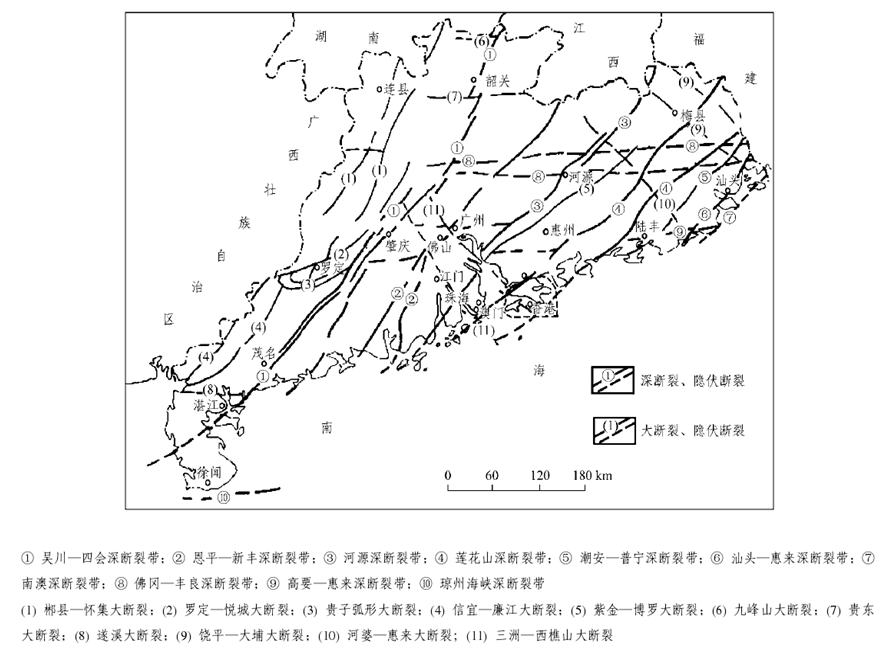 廣東省在大地構造上屬華南褶皺系的一部分,其演化過程經歷了三個發展階段及相應的構造旋回和構造運動:加里東運動形成緊密線型褶皺,主要呈NEE方向,成為廣東省構造骨架的基礎;印支運動形成多方向的過渡型蓋層褶皺;燕山運動以斷塊造山、NE向和EW向深大斷裂控制的火山噴發、巖漿侵入為主。深大斷裂對廣東省的沉積建造、巖漿活動、變質作用和成礦作用有較明顯的控制。主要的深斷裂有吳川-四會、恩平-新豐、河源、蓮花山、潮安-普寧、汕頭-惠來、南澳、佛岡-豐良、高要-惠來、瓊州海峽等,主要的大斷裂有郴縣-懷集、羅定-悅城、貴子、信宜-廉江、紫金-博羅、九峰山、貴東、遂溪、饒平-大埔、河婆-惠來、三洲-西樵山等。這些深大斷裂都具有規模大、活動時間長等特點。從總體上看。廣東省境內大型褶皺和深大斷裂以NE向為主,間夾EW向和NW向構造組成復雜的構造圖景。