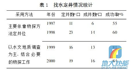 前幾年某單位在水文地質(zhì)領(lǐng)域剛起步,經(jīng)驗(yàn)不足,找水主要依靠物探工作,片面追求效率,急于求成,效果很不理想。后來意識(shí)到了基巖裂隙水地區(qū)水文地質(zhì)調(diào)查工作的重要性,及時(shí)調(diào)整了思路,加強(qiáng)了這方面的工作力度,取得了比較好的結(jié)果。近幾年來基巖裂隙水地區(qū)定井成功率見表1。