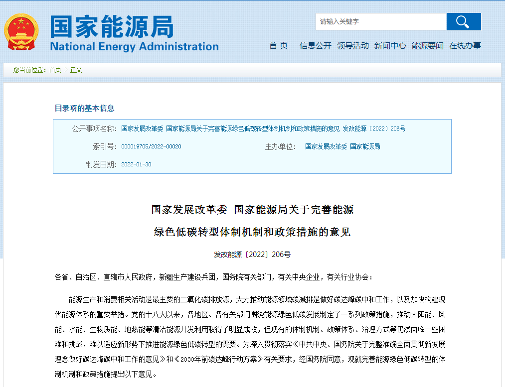 能源生產(chǎn)和消費相關(guān)活動是最主要的二氧化碳排放源,大力推動能源領(lǐng)域碳減排是做好碳達(dá)峰碳中和工作,以及加快構(gòu)建現(xiàn)代能源體系的重要舉措。黨的十八大以來,各地區(qū)、各有關(guān)部門圍繞能源綠色低碳發(fā)展制定了一系列政策措施,推動太陽能、風(fēng)能、水能、生物質(zhì)能、地?zé)?/a>能等清潔能源開發(fā)利用取得了明顯成效,但現(xiàn)有的體制機制、政策體系、治理方式等仍然面臨一些困難和挑戰(zhàn),難以適應(yīng)新形勢下推進(jìn)能源綠色低碳轉(zhuǎn)型的需要。為深入貫徹落實《中共中央、國務(wù)院關(guān)于完整準(zhǔn)確全面貫徹新發(fā)展理念做好碳達(dá)峰碳中和工作的意見》和《2030年前碳達(dá)峰行動方案》有關(guān)要求,經(jīng)國務(wù)院同意,現(xiàn)就完善能源綠色低碳轉(zhuǎn)型的體制機制和政策措施提出以下意見。