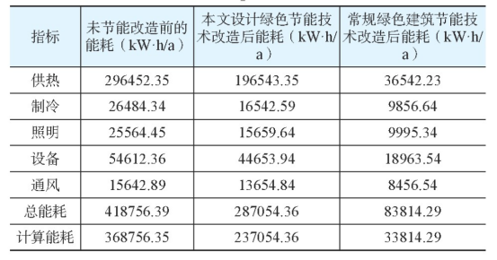 分別使用本文設(shè)計的被動式低能耗綠色建筑節(jié)能技術(shù)和基于專家評分的常規(guī)綠色節(jié)能技術(shù)改造,改造后能耗對比結(jié)果如表1所示。
